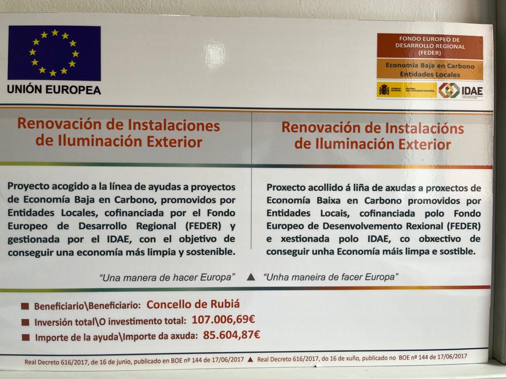 El Concello de Rubiá ha recibido del IDAE, una subvención para la renovación de la iluminación exterior en calles del núcleo de Rubiá, cofinanciada con fondos europeos (FEDER), dentro del programa estatal de ayudas para proyectos de iluminación baja en carbono. Con el fin de conseguir un consumo más limpio y sostenible.